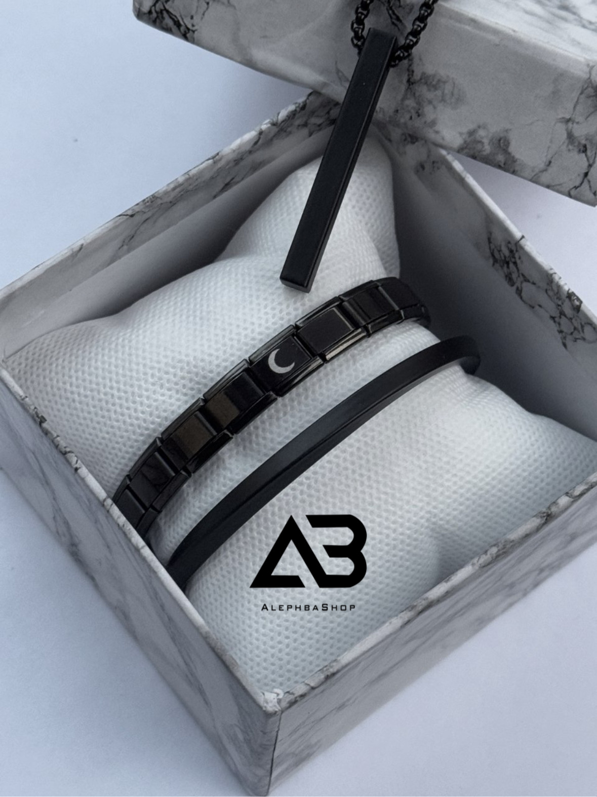 پک هدیه مردانه شامل دستبند چارم گردنبند و بنگل مشکی رنگ ثابت